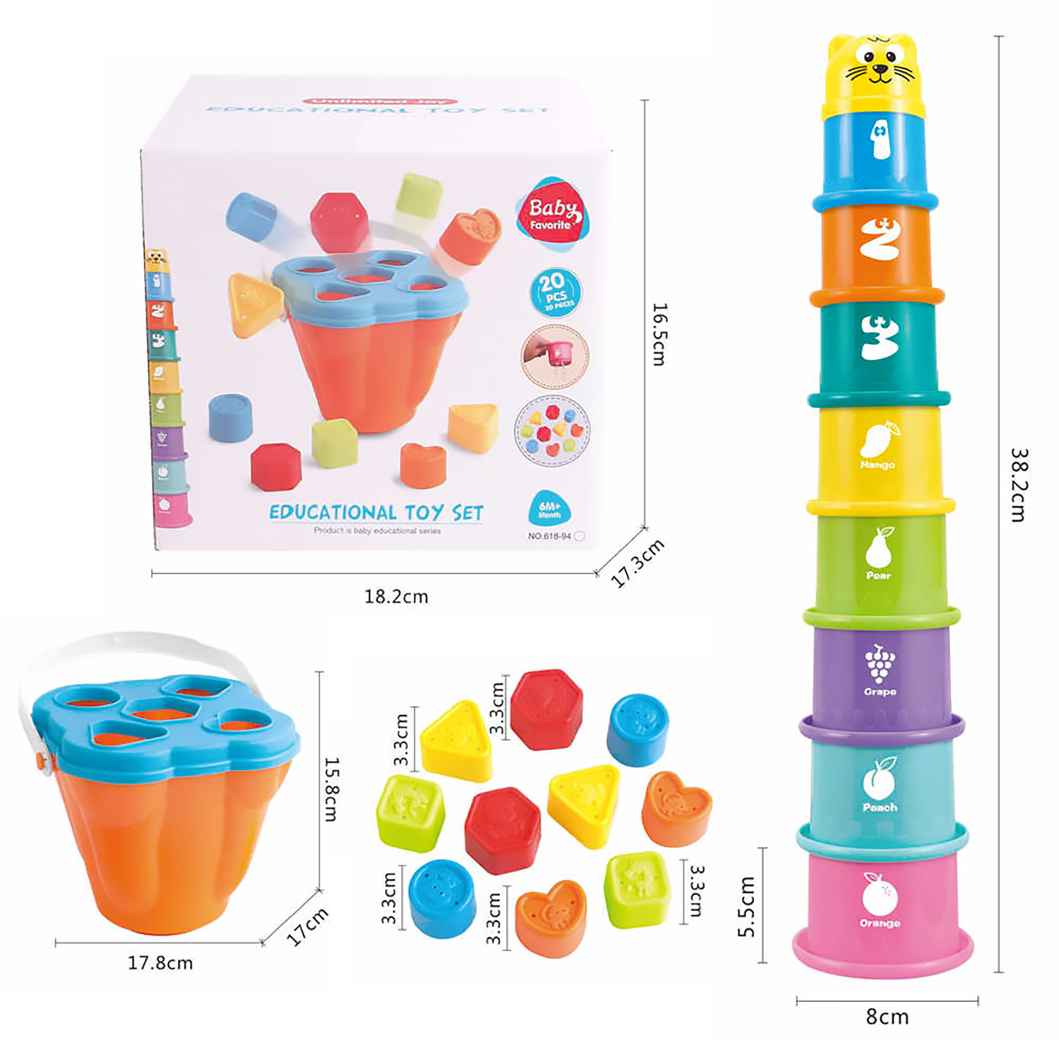 Setul conține piese de marimi si forme diferite, fabricate din materiale sigure pentru copii