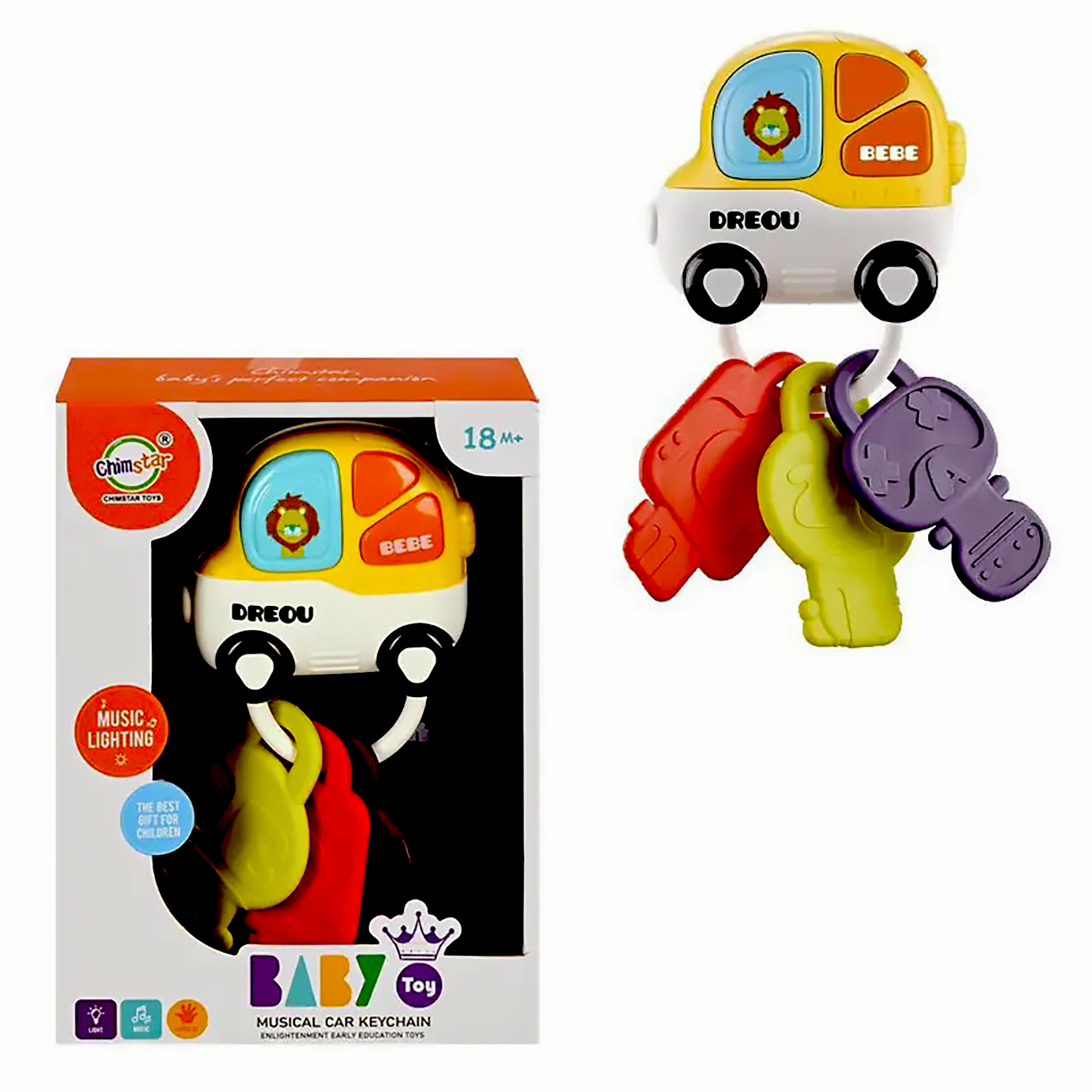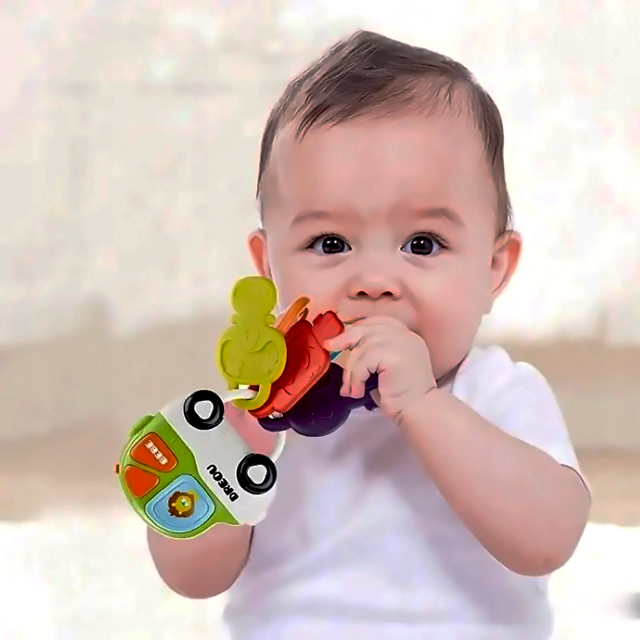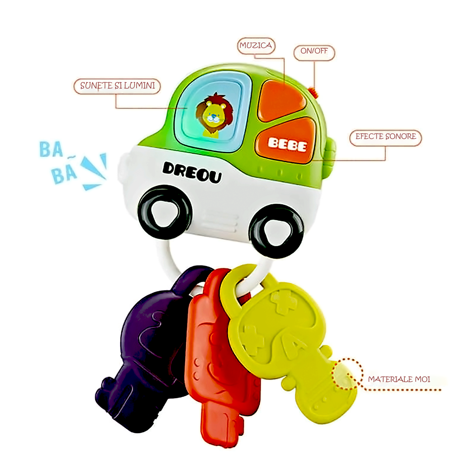 Jucarie interactiva bebelusi Masina tip breloc, dezvolta abilitati motorii si senzoriale, prezinta diferite texturi, striatii, lumini, sunete, plastic si silicon alimentar, + 0 luni, multicolor