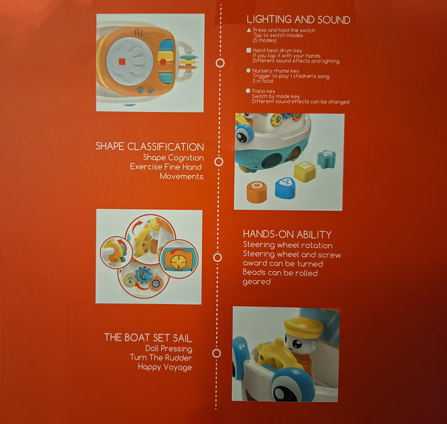 ajuta la exersarea abilitățile motorii fine ale mainii copilului, dobandind precizie in plasarea formelor geometrice prin orificiile create la baza vaporului